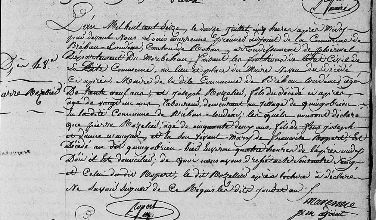 Témoins : Olivier Jegouic, 66 ans, laboureur à La Villepero, Joseph Le Guenec, 42 ans, laboureur à Gueltas